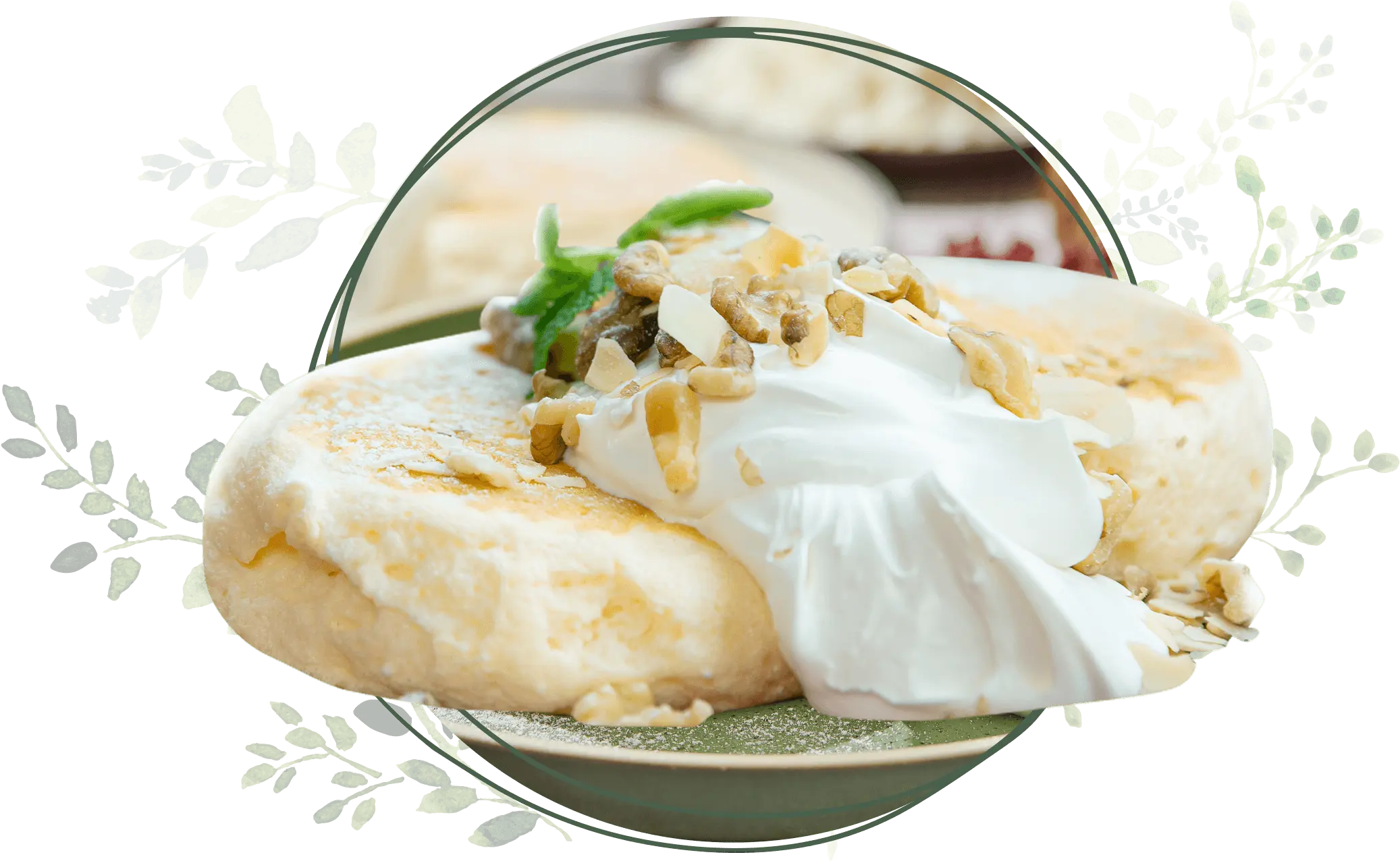 本店舒芙蕾鬆餅所提供之鮮奶油均採用「北海道十勝奶霜」,產自日本北海道十勝地區,具有清爽細緻的口感、濃郁又富含奶香的生乳風味。一入口就可以馬上感受北海道奶霜似雪般入口即化的輕盈口感,與本店特製的舒芙蕾鬆餅完美融合。